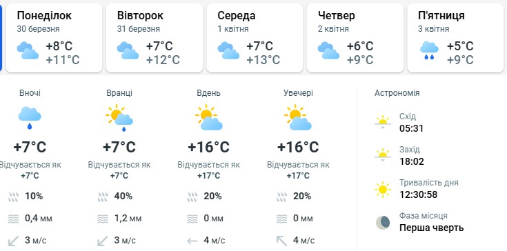 3 квітня: Наприкінці робочого тижня небо може затягнути хмарами, проте ймовірність дощу залишається низькою (не більше 15–20%).