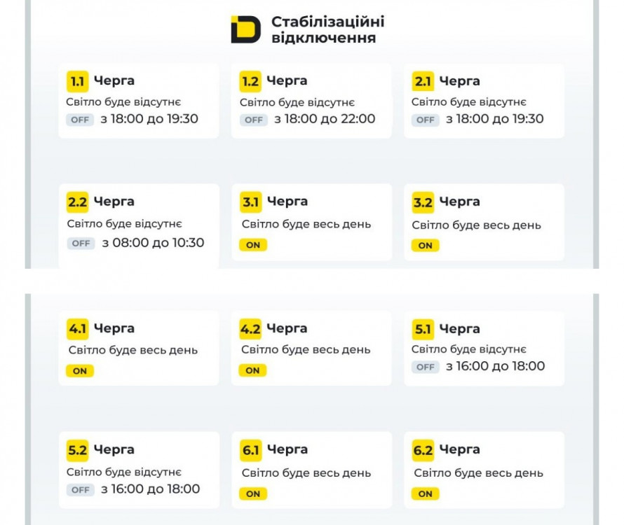- Графіки погодинних відключень: з 08:00 до 11:00 та з 15:00 до 22:00 - обсягом від 0,5 до 1,5 черг,