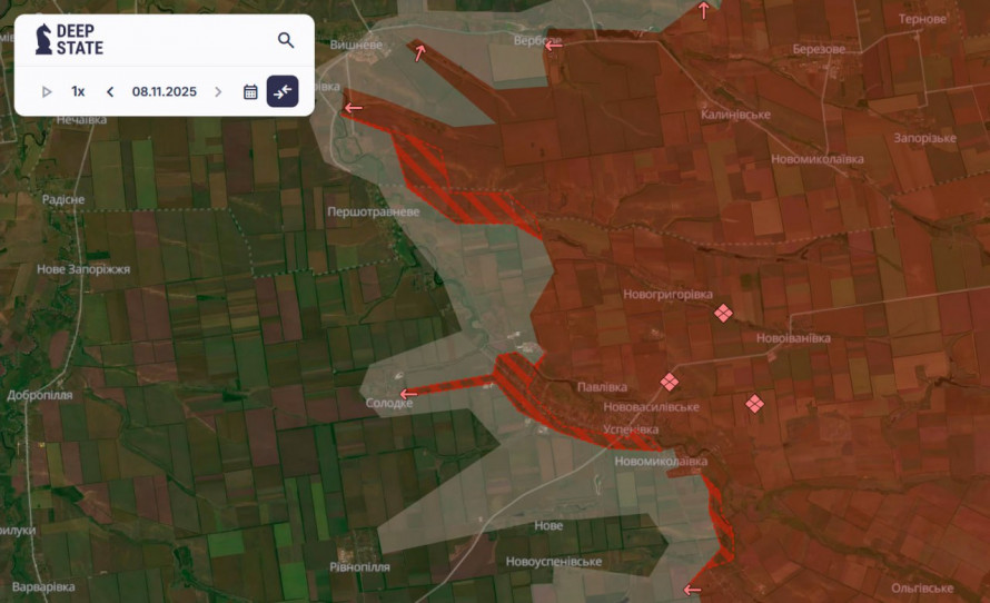 На території Дніпропетровської області спостерігається загострення бойових дій. За даними аналітичного ресурсу DeepState, російські сили змогли просунутися поблизу населеного пункту Злагода (Першотравневе), що розташований на південному сході області.