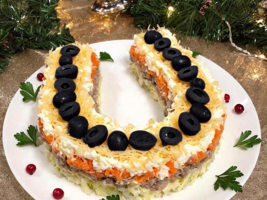 Саме тому салат «Підкова» вважається вдалим вибором для новорічного столу. Свою назву він отримав завдяки характерній формі, у яку викладаються шари. Рецептів цієї страви існує безліч - змінюються інгредієнти, смаки й подача, але незмінною залишається головна ідея: підкова як символ щастя та захисту.