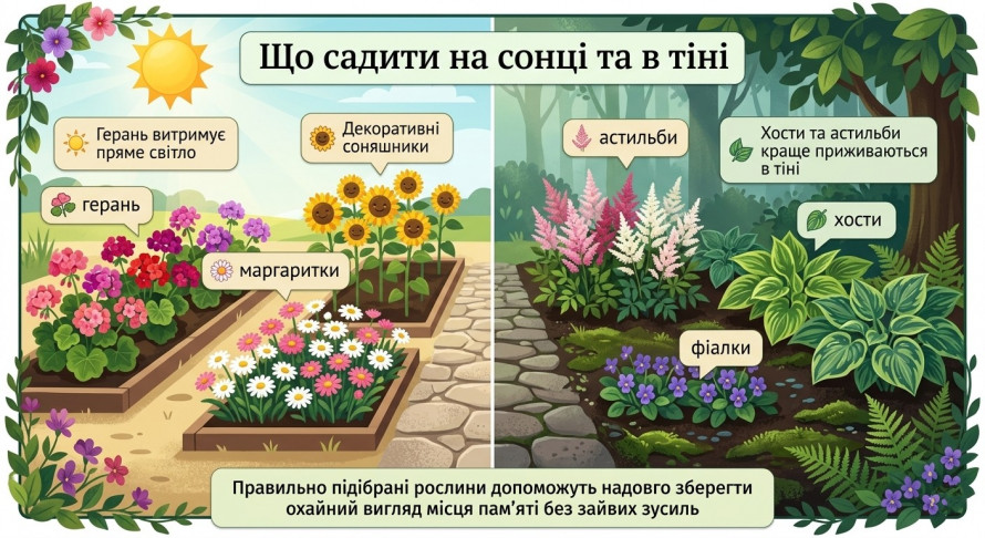 Правильно підібрані рослини допоможуть надовго зберегти охайний вигляд місця пам’яті без зайвих зусиль.
