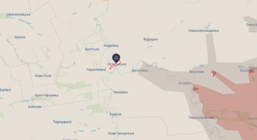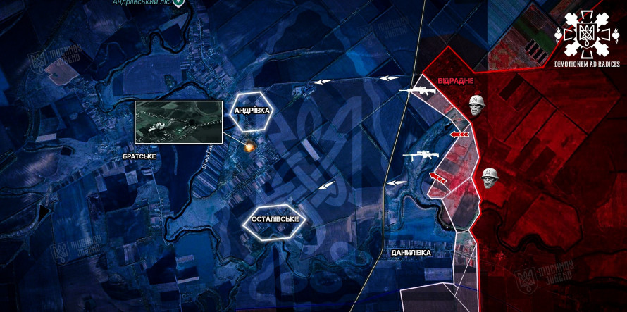 Водночас на південнішій ділянці противник свідомо уникає прямого входу в Данилівку. Село поки не перебуває під фронтальним тиском, натомість російські сили здійснюють обхідний маневр північним флангом, просуваючись уздовж русла річки. Така схема дозволяє мінімізувати втрати під час лобових атак і водночас створює загрозу виходу на підступи до Остапівського з вигідніших позицій.