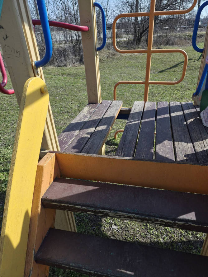 - Зруйновані конструкції: На ігрових комплексах відсутні цілі листи покриття, а дерев’яні дошки прогнили або вибиті, що може призвести до падіння дитини з висоти.