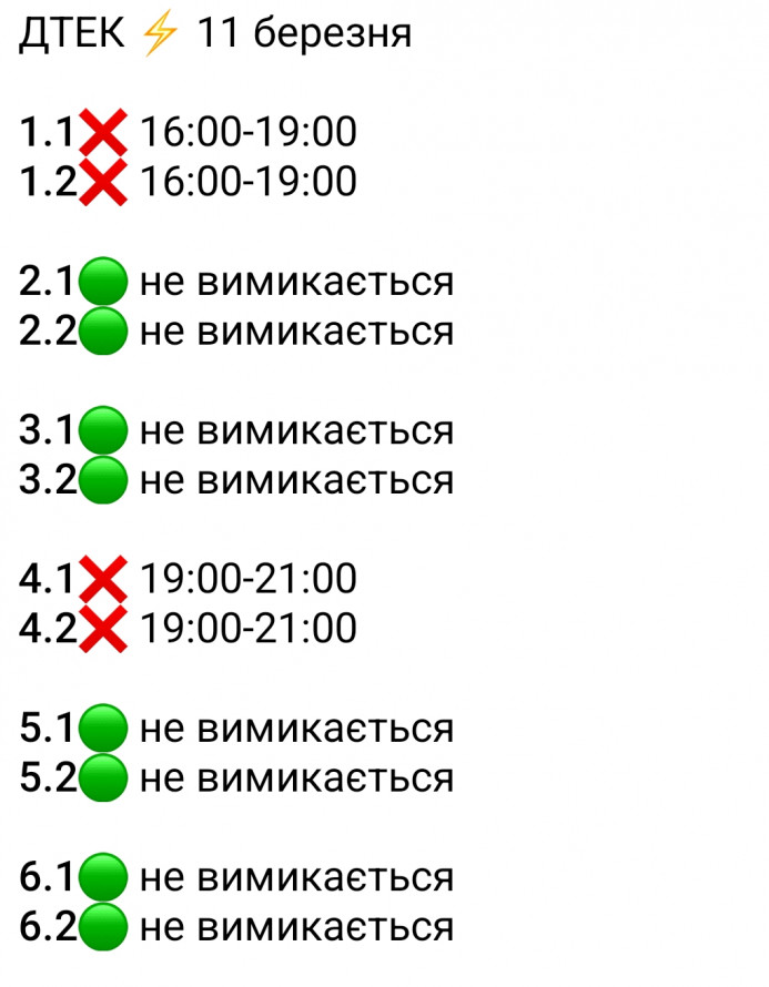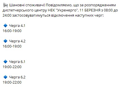 ДТЕК «Дніпровські електромережі» зазначає, що 11 березня обмеження будуть застосовуватися згідно із затвердженими чергами. Наразі область розділена на 6 груп, для кожної з яких передбачені періоди «сірої» (світло відсутнє) та «білої» (світло є) зон.