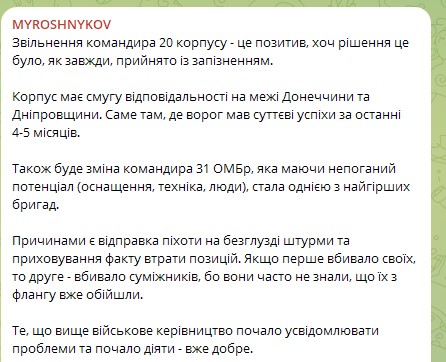 Військовий кореспондент та блогер Богдан Мірошников відзначив, що звільнення командира 20-го корпусу є позитивним кроком, хоч і запізнілим. За його словами, проблеми стосувалися не лише втрат позицій, а й організації бойових дій. Мірошников наголосив, що у 31-й окремій механізованій бригаді, яка мала достатній потенціал, виявилися серйозні прорахунки – від безрезультатних штурмів до приховування втрати оборонних ділянок. Такі дії не лише послаблювали оборону, а й створювали додаткові загрози для сусідніх підрозділів.